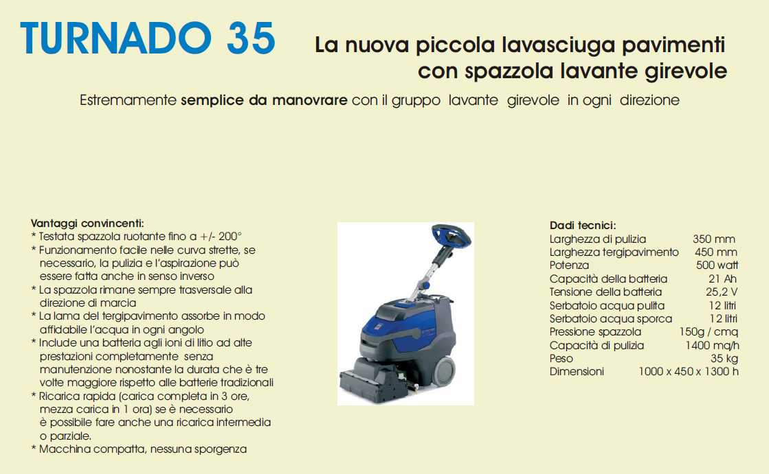 Maneggevole, facile da usare e facile da mantenere, questa lavasciuga è uno strumento altamente professionale ed efficiente per la pulizia di piccole aree e superfici ingombranti. La macchina è dotata di una spazzola cilindrica inserita in una testata lavante/asciugante che gira completamente con il sistema Turnado, in grado di lavare ed asciugare anche in retromarcia. La tecnologia che lo rende perfetto per curve strette. Può così pulire in senso inverso, se necessario (per mancanza di spazio, ecc). La nuova batteria al litio ha una durata prolungata, il che la rende 3 volte più resistente delle normali batterie al piombo. E ' veloce da ricaricare. Il design leggero della macchina vi aiuta a regolare i passi e facilita il trasporto. La modalità di efficienza ecologica riduce il consumo di energia, aumenta il tempo di esecuzione e abbassa il volume di circa il 40%. Mai pulizia e´stata cosa così semplice e, inoltre, ha dato tanto piacere.