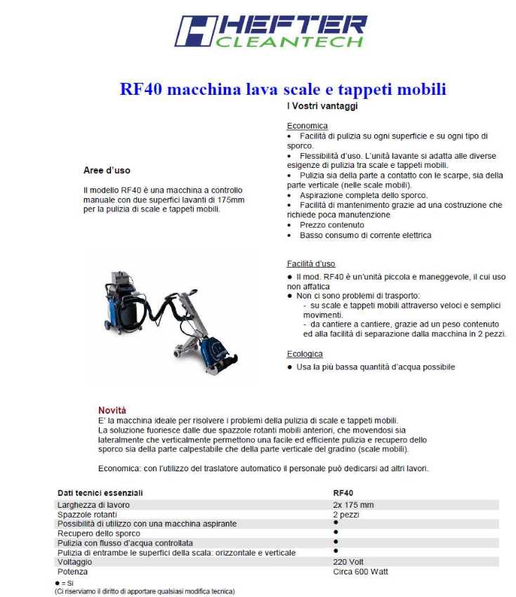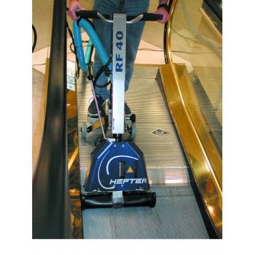 La RF 40 è un'unità con tecnologia brevettata, che viene fornita pronto a l´uso con un aspirapolvere industriale modificato. La RF 40 pulisce passo dopo passo la scala mobile lasciando ad ogni passo tutto super pulito.